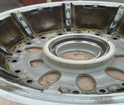 需要翻新處理的飛機(jī)輪轂外形尺寸:Φ450-700*H140-400mm (看看,才幾天的飛行,飛機(jī)起降對輪胎、輪轂的沖擊有多大!) 噴砂后接受探傷檢測時(shí)的輪轂,讓損傷一覽無余!